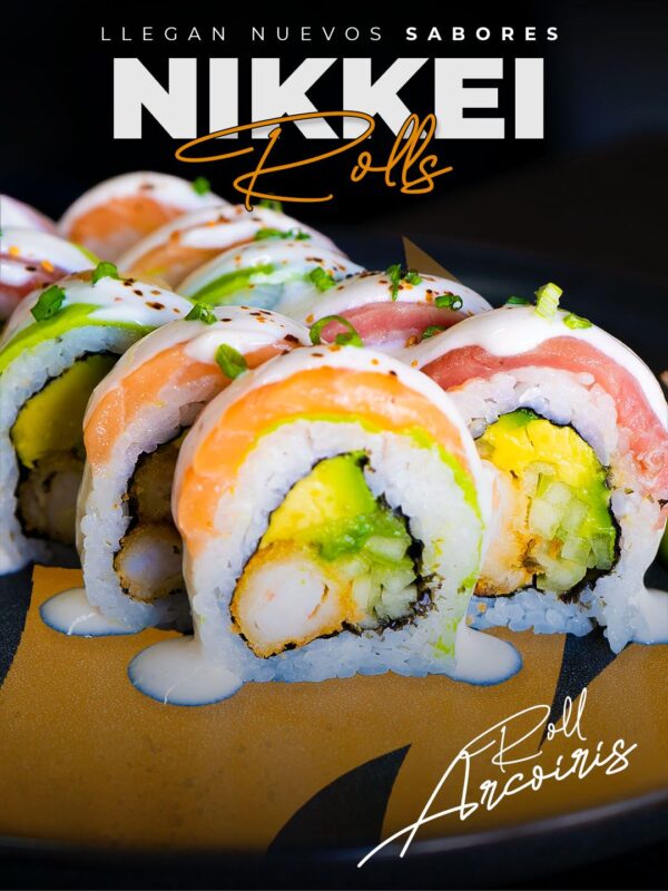 Camarón furay, pepino, palta. Envuelto en salmón, atún, palta. con salsa Nikkei.